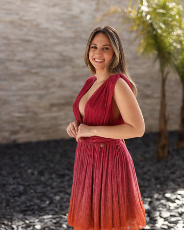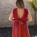 Prepare-se para deslumbrar com o vestido plissado degrade da Alma Sanchez, uma peça que combina sofisticação, feminilidade e um toque de modernidade. Este vestido é mais do que uma simples peça de roupa, é uma expressão de estilo e graciosidade que cativará todos os olhares. O destaque deste vestido é o seu design plissado delicado, que adiciona textura e movimento encantadores a cada passo. O efeito degrade, que transita suavemente entre tonalidades deslumbrantes, acrescenta uma dimensão adicional de elegância e charme ao visual.