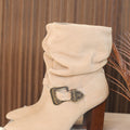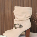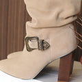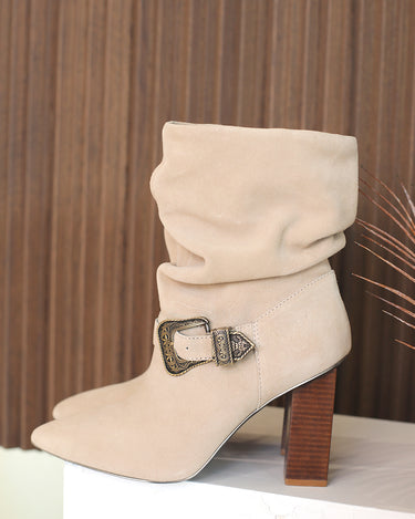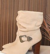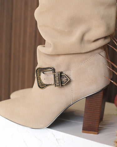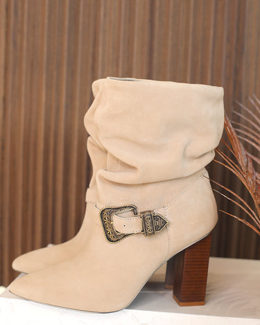 Bota de couro liso com biqueira pontiaguda e bloqueio de salto alto. Uma fivela de boho vintage recorda a inspiração desta temporada.