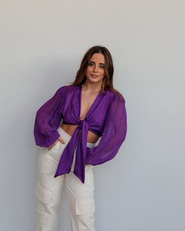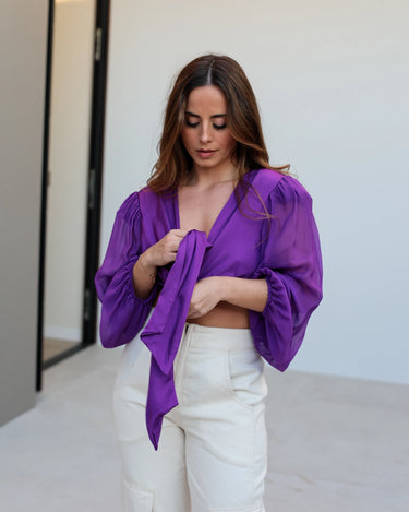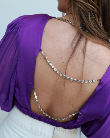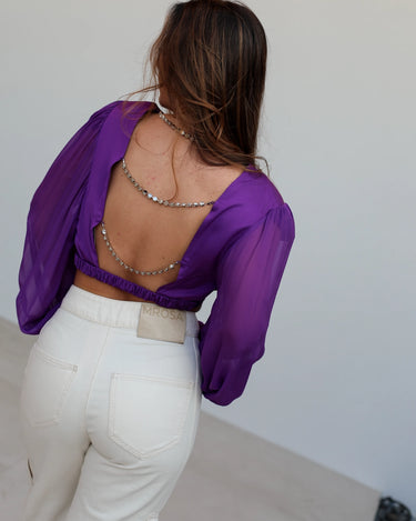 Esta blusa roxa em tecido acetinado destaca-se pelo design elegante e pelo detalhe sofisticado nas costas. Elegante, moderna e perfeita para destacar-se em eventos ou saídas especiais.