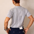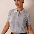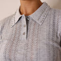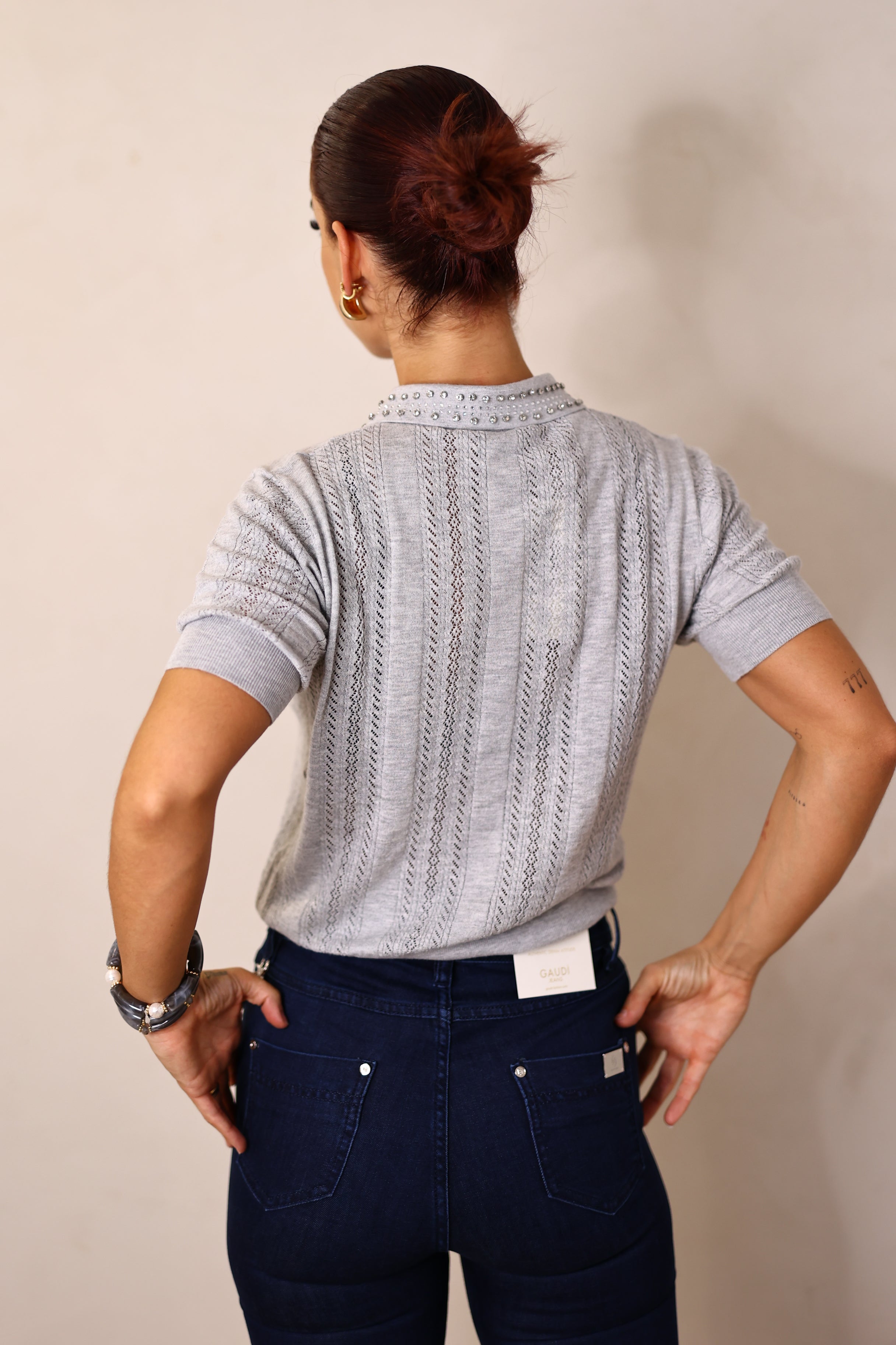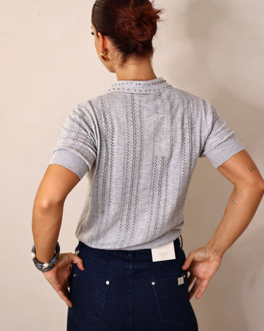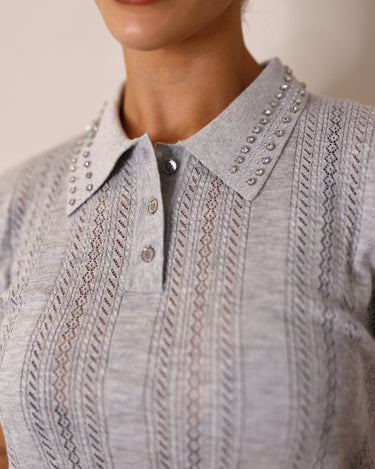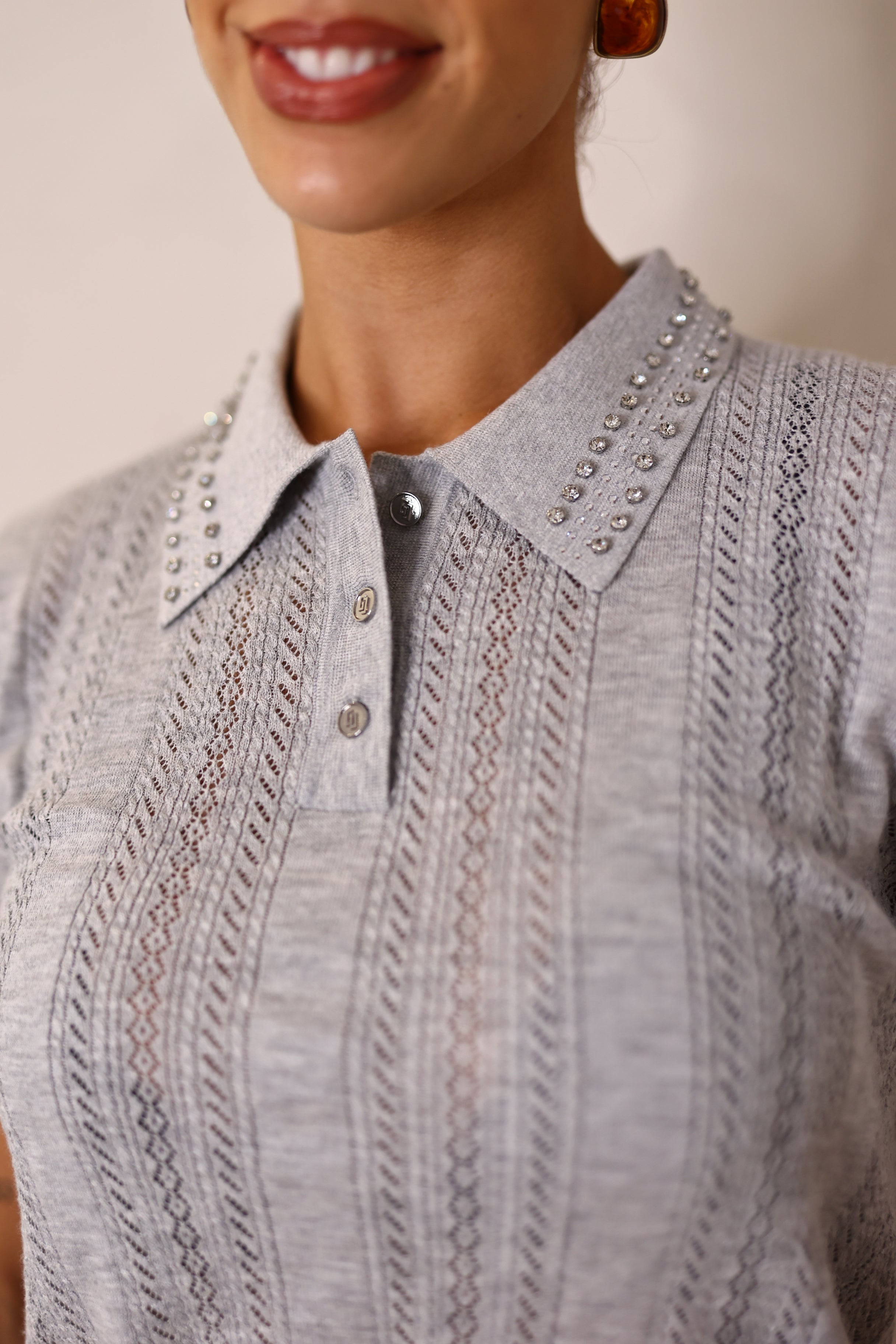 Camisola cinza em malha delicada, com padrão rendado vertical que adiciona textura e elegância. O colarinho clássico com aplicação de pérolas dá-lhe um toque feminino e distinto, ideal para quem gosta de detalhes elegantes.