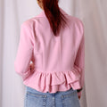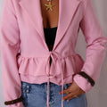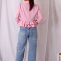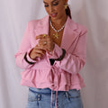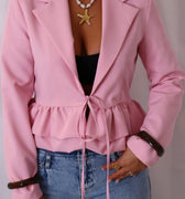 Este blazer curto com folho é a combinação perfeita de sofisticação e feminilidade. Com um corte estruturado que valoriza a silhueta, o detalhe em folho acrescenta um toque delicado e elegante. Ideal para looks modernos e versáteis, é a peça chave para quem procura um equilíbrio entre classe e estilo romântico.