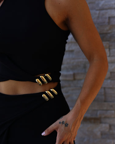 Top em malha canelada com pormenor dourado, moderno e elegante. Ideal para looks casuais ou sofisticados, acrescentando um toque de estilo único.