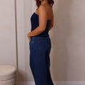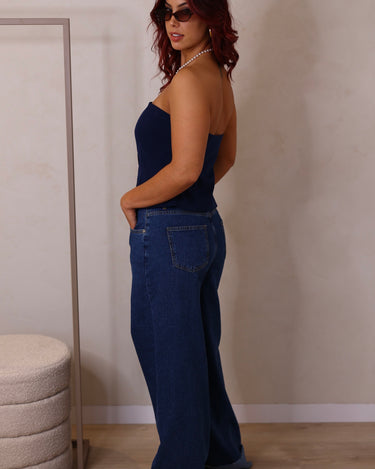A calça pantalona denim é uma peça confortável e estilosa, que combina o corte amplo e fluido da pantalona com o tecido clássico da ganga. Ideal para quem procura um look casual, mas sofisticado.