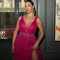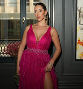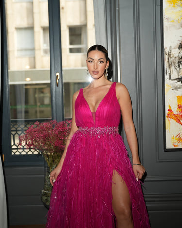 O vestido com plumas da Susanna Rivieri é uma expressão de elegância e sofisticação. Com um design que valoriza a qualidade e a experiência, cada vestido é uma obra de arte que combina tecidos requintados, embelezamentos cuidadosamente selecionados e um beadwork feito à mão que é sinônimo de modernidade e atenção aos detalhes. Estes vestidos são ideais para ocasiões cerimoniais, onde a individualidade e a construção clássica são celebradas em cada peça.