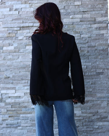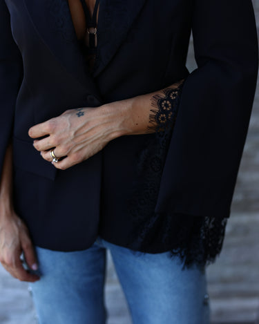 Alfaiataria sofisticada com toque delicado de renda, que acrescenta elegância sutil e modernidade ao visual.