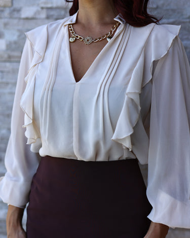 Uma peça leve e elegante, com detalhe em colar que valoriza o decote e elimina a necessidade de acessórios extras. Versátil para combinar do casual ao sofisticado.
