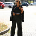 A calça com brilho e faixa é uma peça ousada e sofisticada que adiciona um toque de glamour ao seu visual. O brilho confere um efeito luminoso e festivo, enquanto a faixa ao longo das laterais, traz um elemento de contraste estiloso.