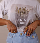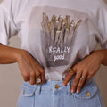 A t-shirt com estampa de batatas fritas é a escolha perfeita para quem ama um toque divertido e descontraído no visual. Com um design moderno e estiloso, essa peça traz personalidade e bom humor para qualquer look. Versátil e confortável, é ideal para looks casuais, cheios de atitude e originalidade.